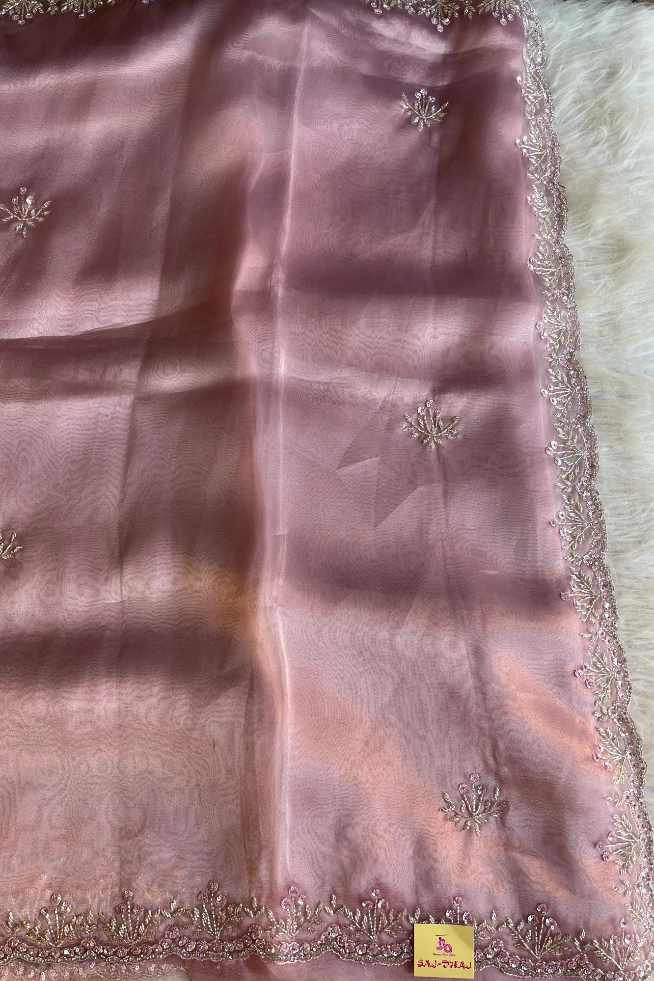 Elegant Self-Sequined Organza Saree with Cutdana Work |Hand Embroidered Blouse 5434 13 (Pink)