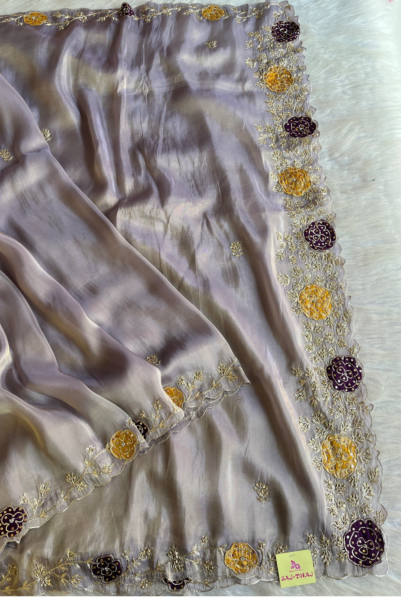 Grace meets comfort in this soft lavender tissue silk saree, adorned with purple and yellow appliqué floral work, elevated with zardozi embroidery and aari dori detailing. The saree’s subtle sheen and lightweight drape make it effortlessly elegant. It comes with a pre-stitched designer blouse, perfectly tailored to match the saree’s rich yet modern aesthetic – ideal for festive and semi-formal occasions.