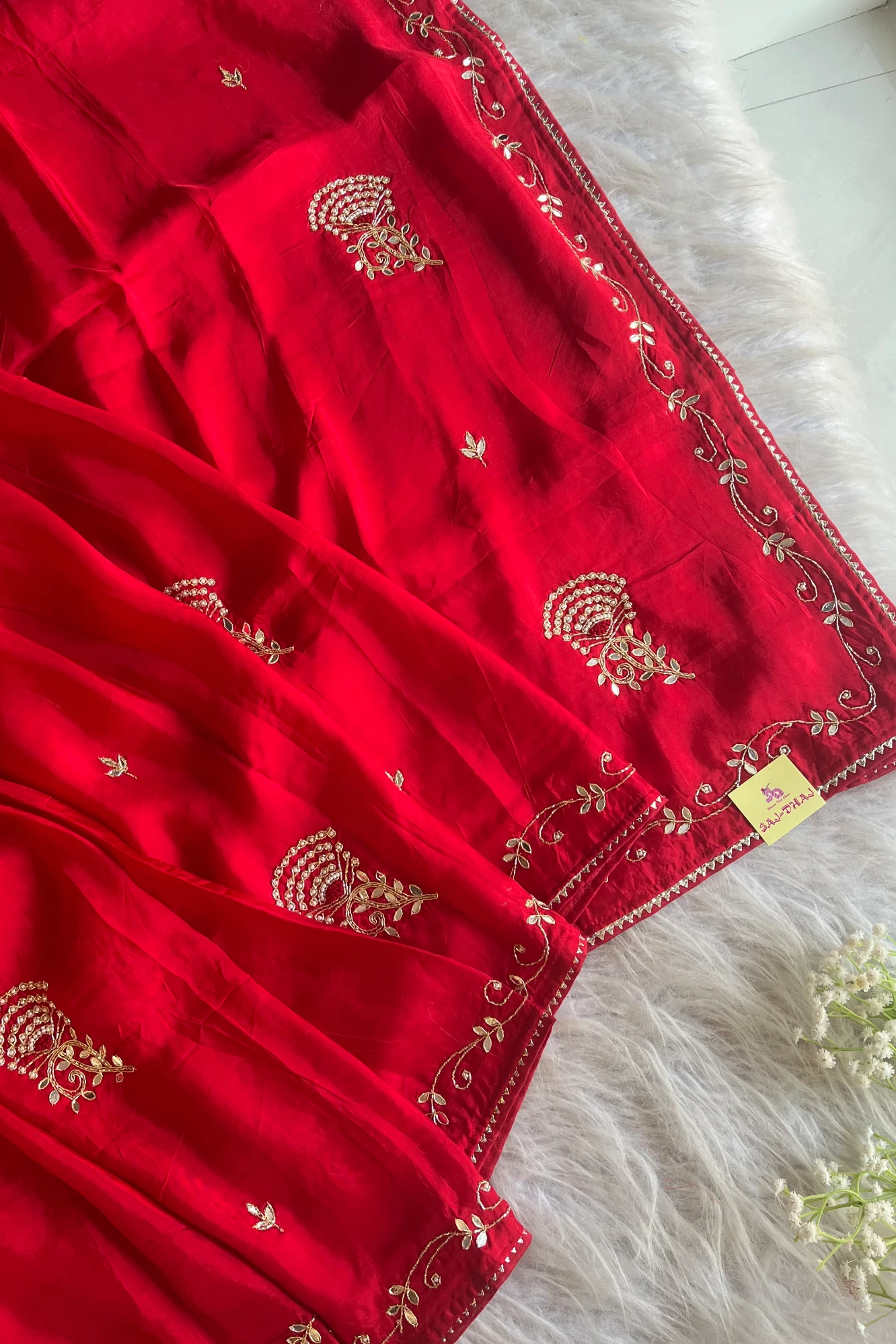 Elevate your ethnic style with this elegant ombre-shaded Russian silk saree, featuring a delicate scallop border embellished with pearls and all-over gota buttis. Soft, flowy, and rich in detail, it comes with a matching running unstitched blouse to complete the look. Perfect for weddings, festive gatherings, and graceful evening events.
