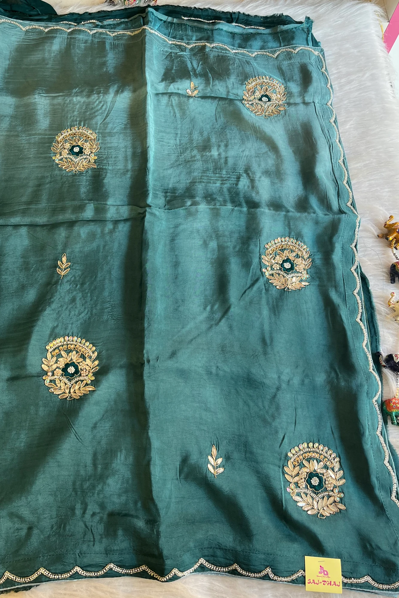 Ombre Russian Silk Saree with Scallop Pearl Border & Gota Buttis | Running Blouse (Peacock Blue) 5435 02