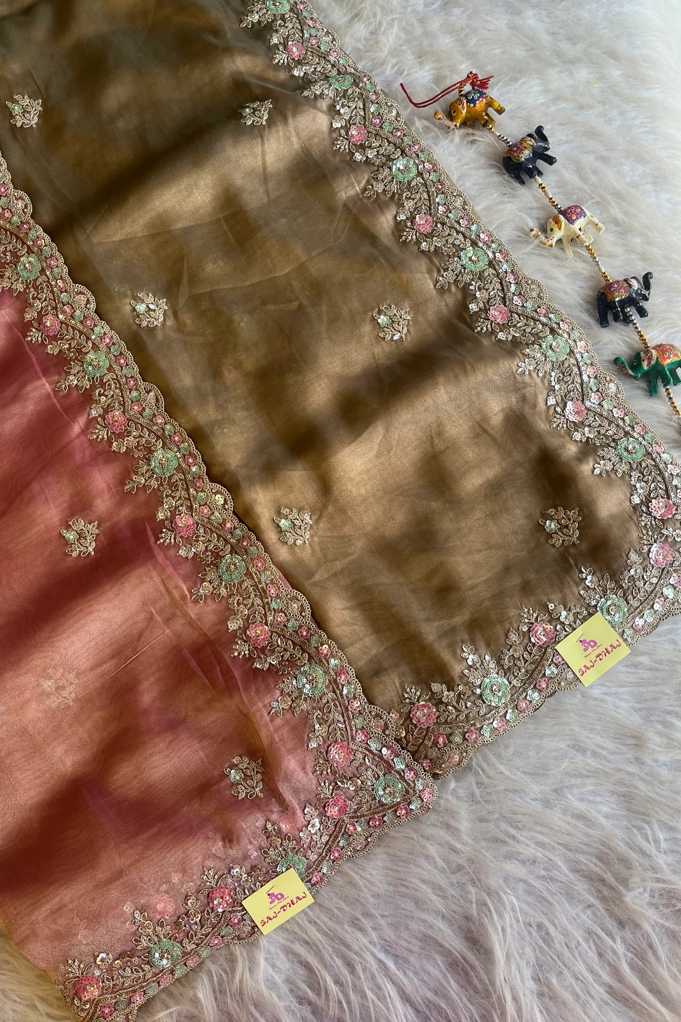 Make a dazzling statement in this elegant shimmery tissue saree, adorned with multicoloured sequin highlights and intricate aari dori embroidery. Perfect for festive nights and celebrations, it comes with a matching heavy running blouse for a complete and glamorous look.