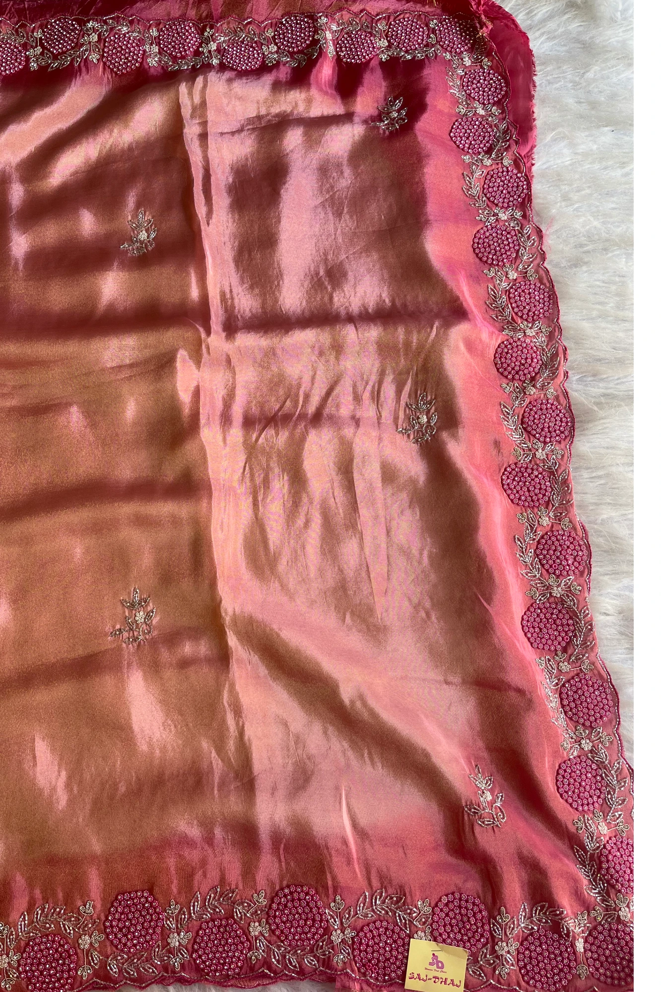 Turn heads with this graceful soft tissue saree, featuring a beautifully shaded heavy border embellished with beads, cutdana, stones, and pearls for a luxurious finish. Elegant and lightweight, it comes with a matching single-colour unstitched blouse, making it perfect for weddings, festive evenings, and grand celebrations.